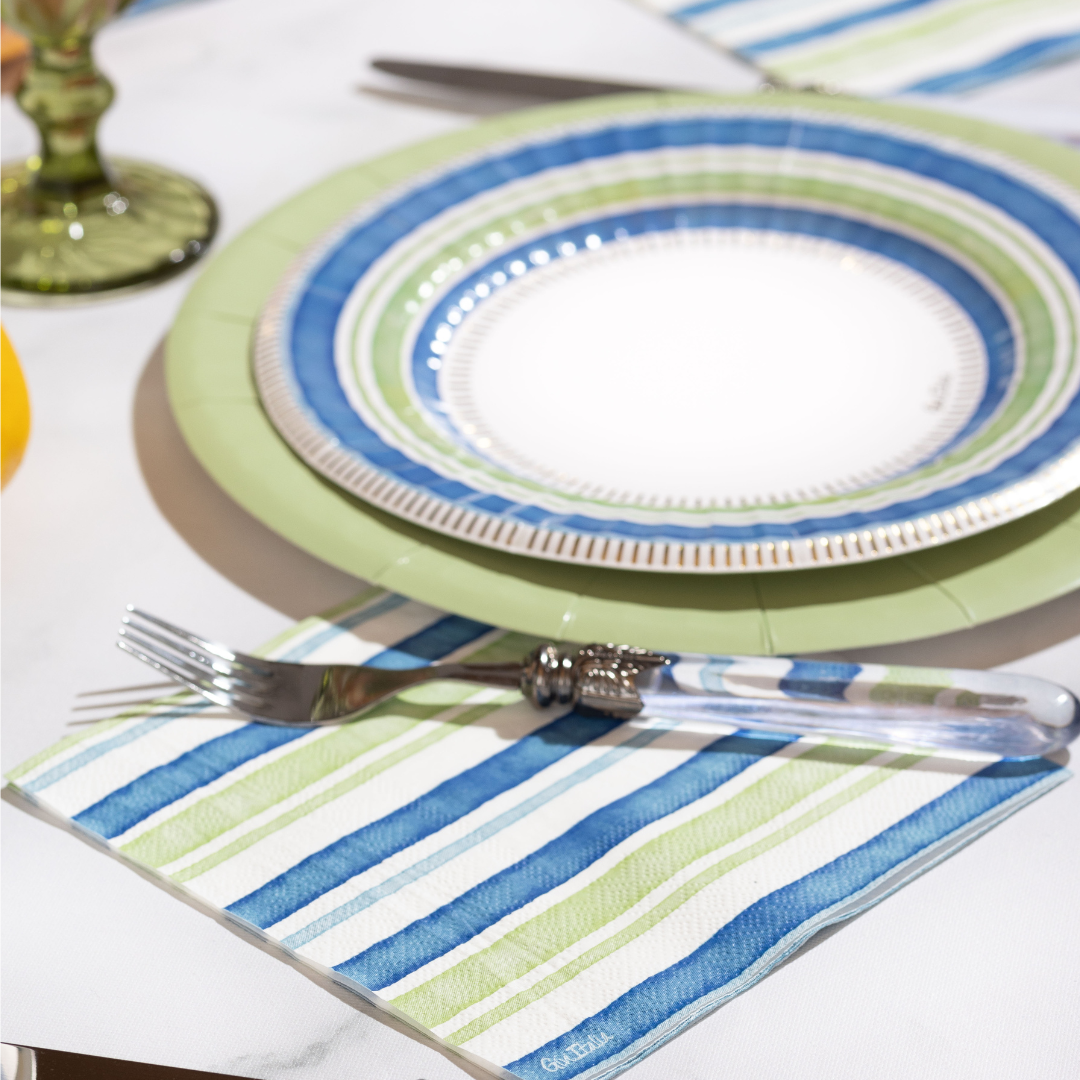 Piatti in cartoncino a righe blu, verdi ed eleganti rifiniture in oro, ideale per una tavola allegra e raffinata