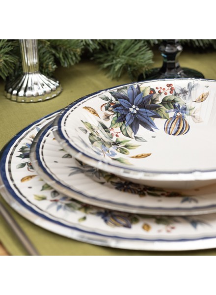 Piatti in cartoncini blu e argento per una tavola Natalizia regale ed elegante.